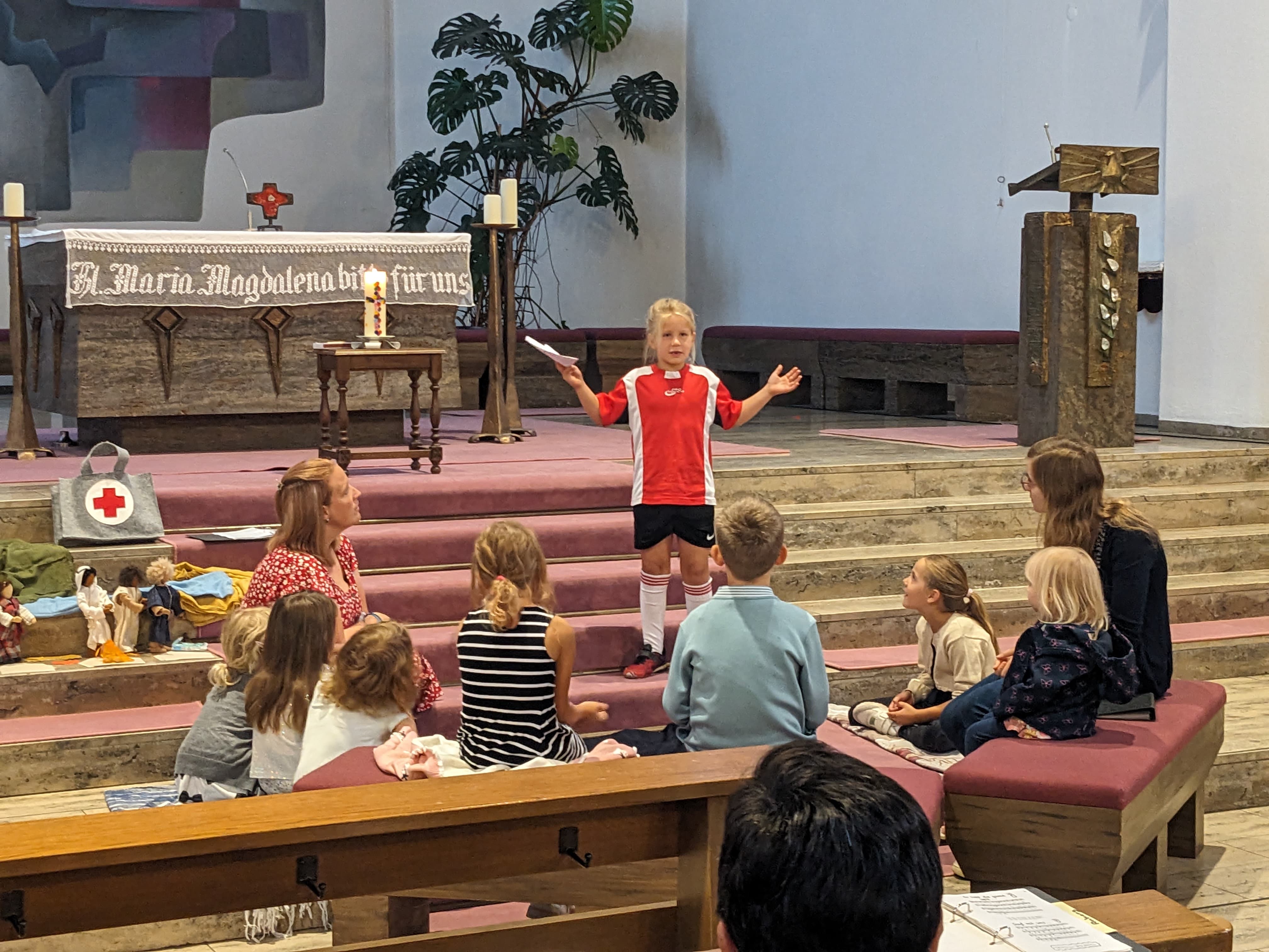 Bei den Fürbitten haben die Kinder Symbole aus einer Rot-Kreuz-Notfalltasche gezogen und in der Mitte abgelegt.