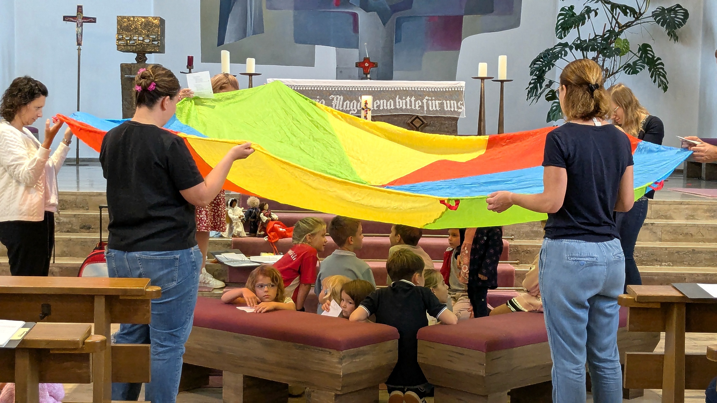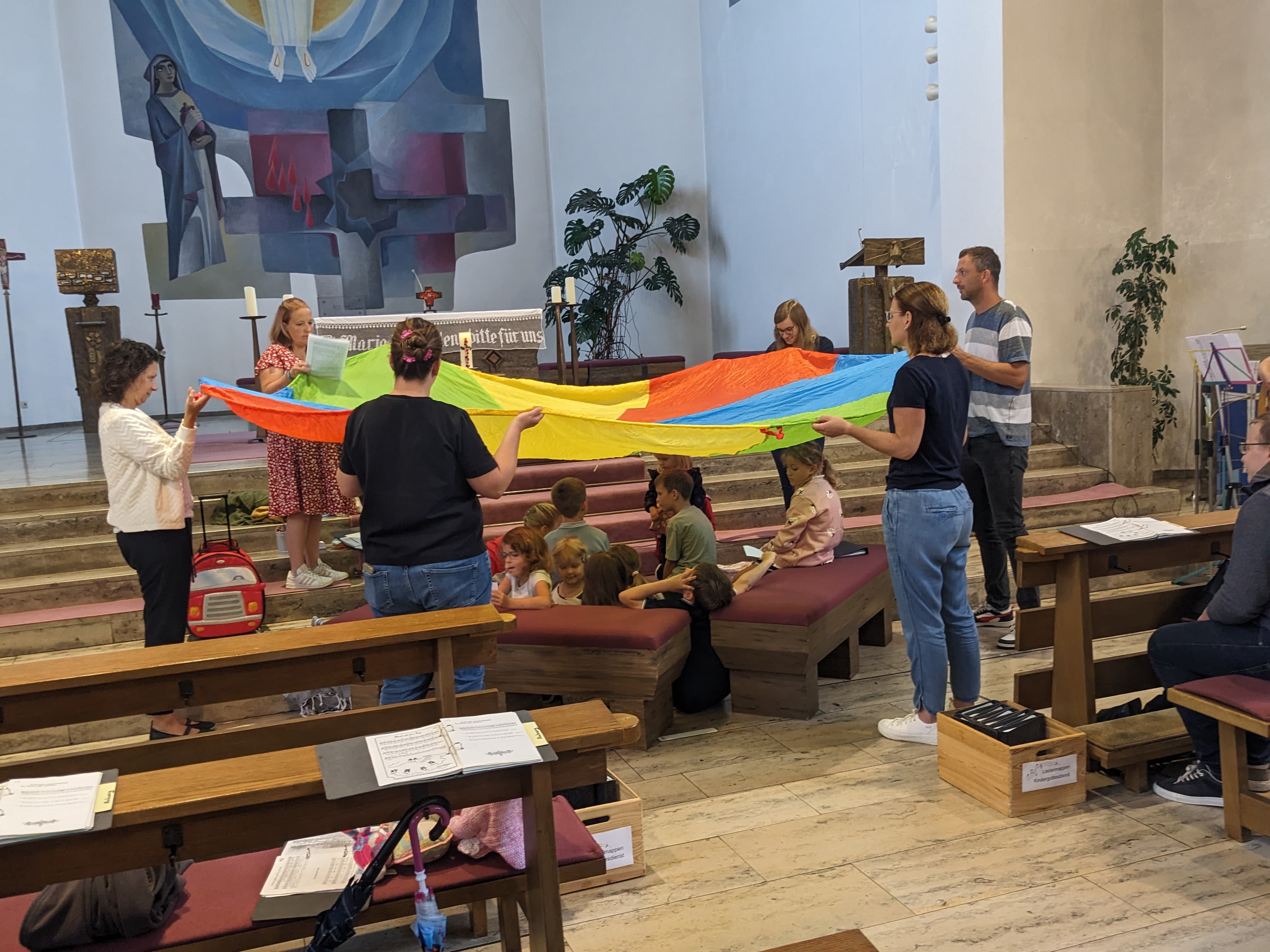 Zum Segen spannten einige Erwachsene einen Fallschirm über die Kinder. Gott, dein guter Segen ist wie ein großes Zelt.